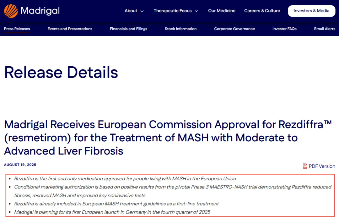 2025年8月19日,歐盟委員會正式批準Rezdiffra?(Resmetirom)上市,用于治療伴有中度至進展期纖維化的代謝相關脂肪性肝炎(MASH)患者。Rezdiffra?成為歐盟該疾病領域首個且目前唯一獲批的藥物,并且已被納入歐洲MASH治療指南。