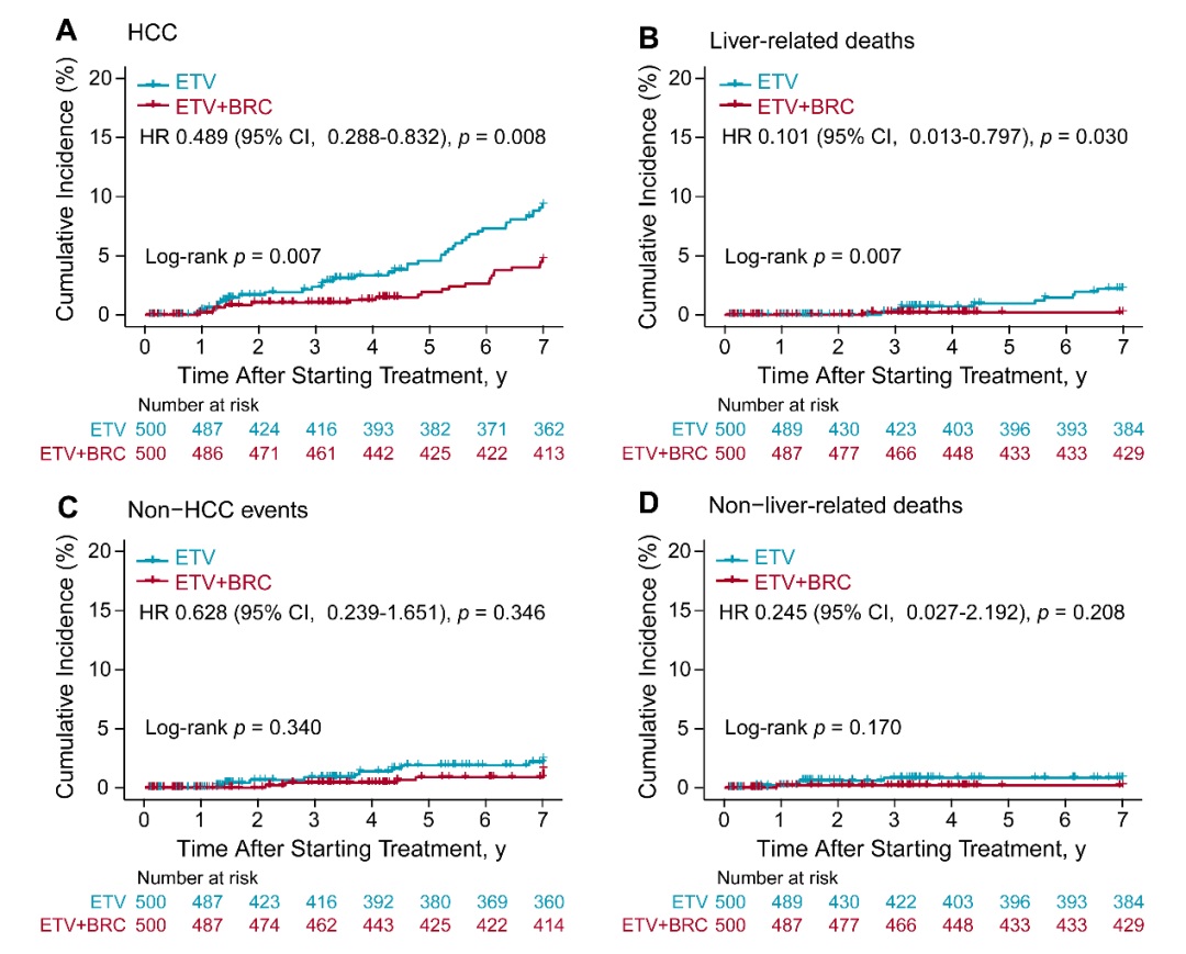 圖1. ETV+BRC組與ETV單藥組7年累積(非)肝癌發(fā)生率和(非)肝臟相關(guān)死亡率比較