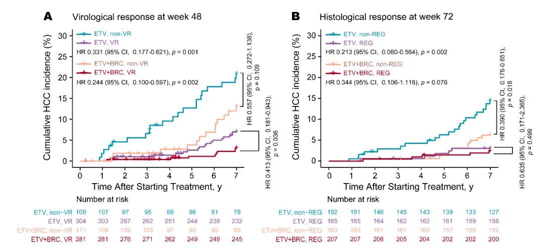 圖2. ETV+BRC組與ETV單藥組48周病毒學(xué)應(yīng)答、72周組織學(xué)應(yīng)答與肝癌累積發(fā)生率的相關(guān)性
