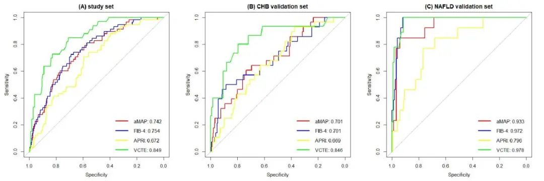 結(jié)果表明,CHB和NAFLD患者中肝硬化占比分別為10.0%和8.1%。在研究組,aMAP評(píng)分診斷肝硬化的AUC為0.742,與FIB-4(0.754)和APRI(0.672)相當(dāng)(P>0.05)。在CHB驗(yàn)證組獲得了類(lèi)似結(jié)果,而在NAFLD驗(yàn)證組中,aMAP評(píng)分診斷肝硬化的AUC高達(dá)0.933,與FIB-4相當(dāng)(0.972,P>0.05)并且顯著高于A(yíng)PRI(0.796,P<0.05)(圖1)。<>